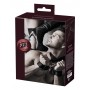 Collar and handcuffs made with sturdy fabric-covered straps that are infinitely adjustable with a D-ring on the front is attached to the cuffs with a carabiner